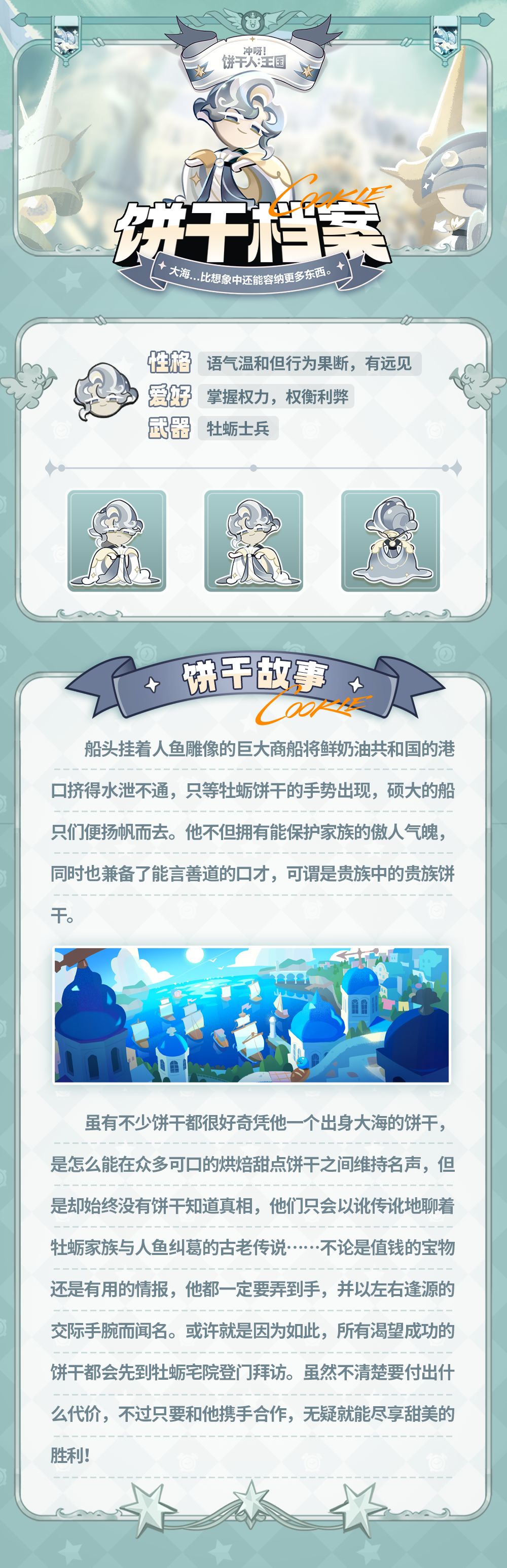 牡蛎饼干不但拥有能保护家族的傲人气魄,同时也兼备了能言善道的口才,可谓是贵族中的贵族饼干……不论是值钱的宝物还是有用的情报,他都一定要弄到手,并以左右逢源的交际手腕而闻名。或许就是因为如此,所有渴望成功的饼干都会先到牡蛎宅院登门拜访。虽然不清楚要付出什么代价,不过只要和他携手合作,无疑就能尽享甜美的胜利!
