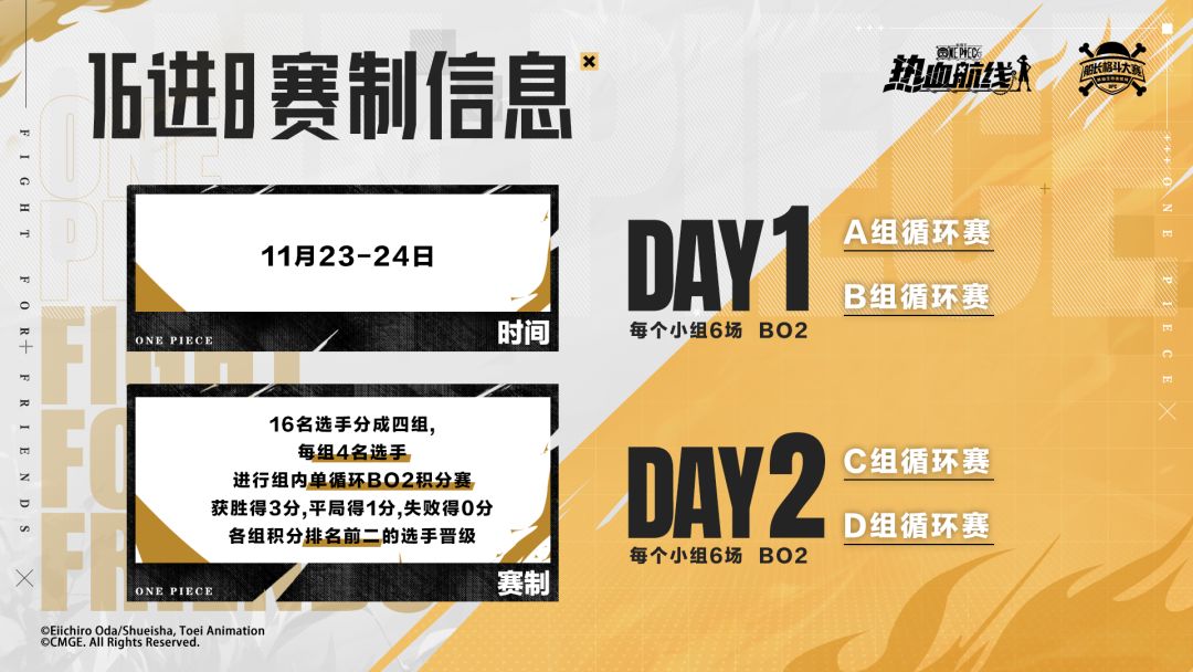 11月23日~11月24日每日17:00,前往游戏内及各大官方平台搜索“航海王热血航线”观看赛事直播,一起见证八强诞生!