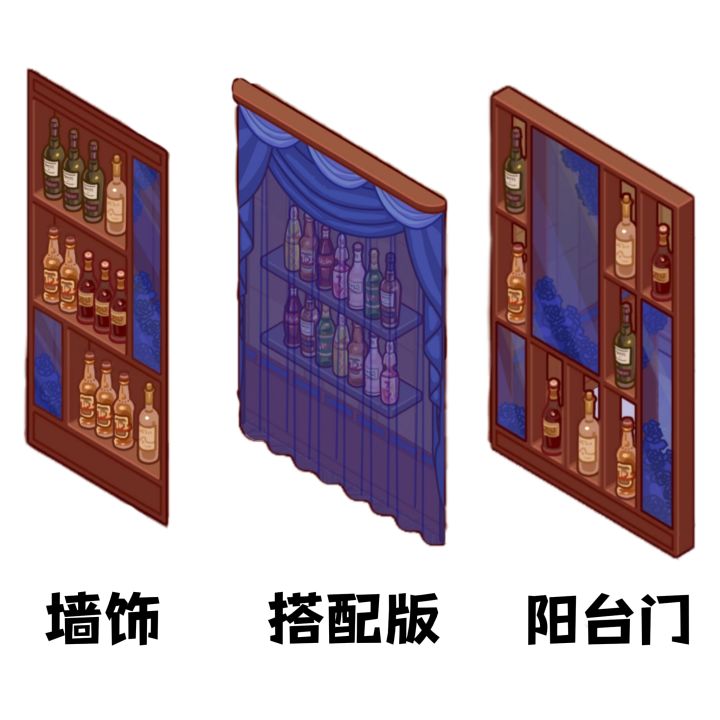 中间的酒柜是用摆件+墙饰+套间屏风搭配出来的,另外两个是套间现成的部件。