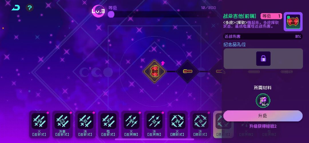 现在你就可以选自己中意的武器进行升级了,我拿吉他战斧举例,可以看到右下角我们消耗的是环月晶矿,升级下面有个获得2经验,有的是获得12经验,每种武器获得的经验不一样不多赘述了。