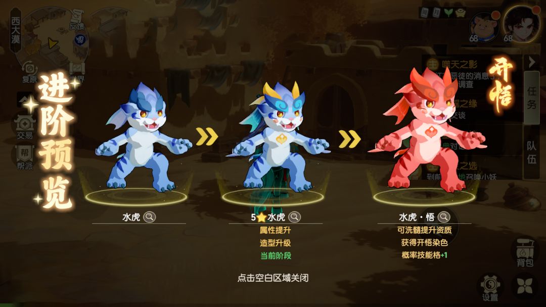水虎的技能就写了两个字:连击,升星之后则是提高连击概率,针对血量低的目标快速收割能力再次提升,在前期没有神兽重明鸟时推荐使用水虎过度。
