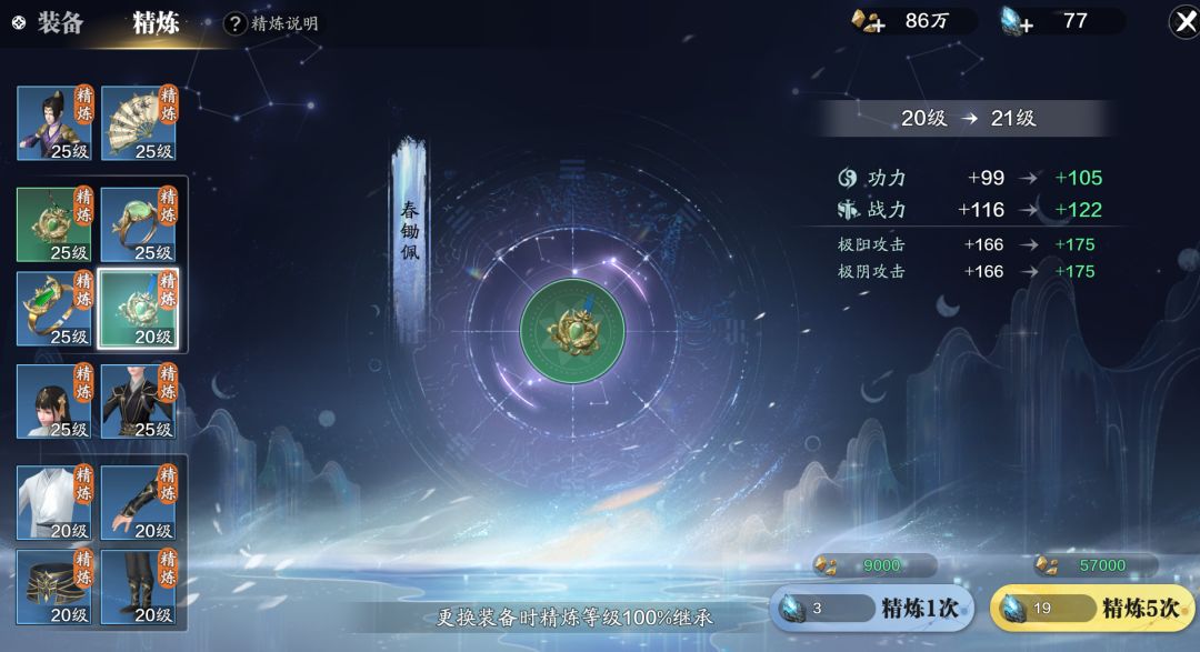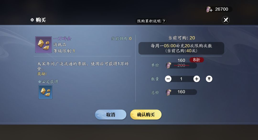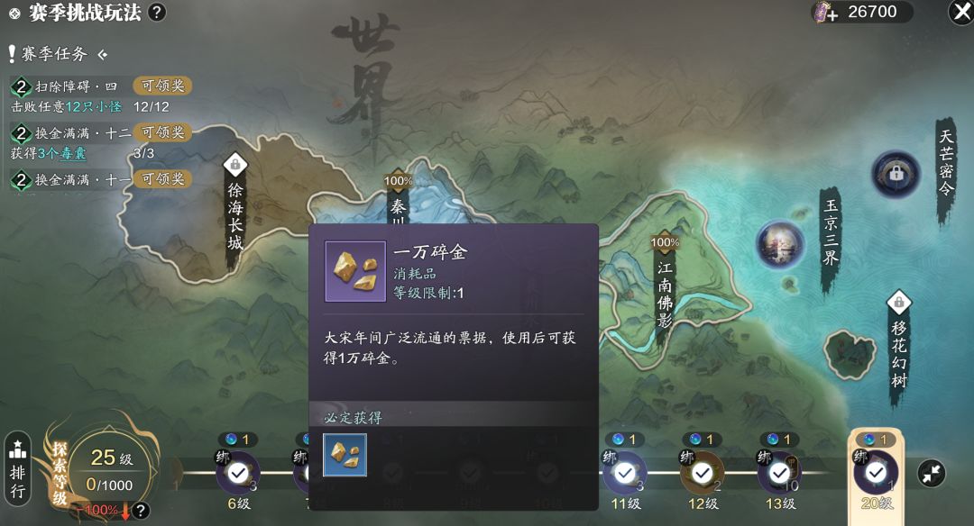 碎金用途:作为赛季服新版本中最基础的货币,用途非常广泛。可以用于装备的精炼,璞玉的鉴定,也可以在赛季令商店中的珍品里购买金疮药、活血散、好感度等道具,以及身份商店,剧情商店里的各种道具。