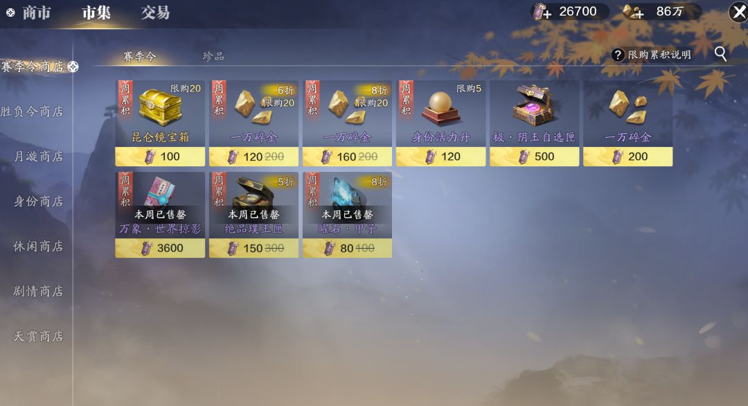 赛季令用途:可以在赛季令商店购买周累积的强化材料,碎金,活力丹等道具,每周限量获取30000。