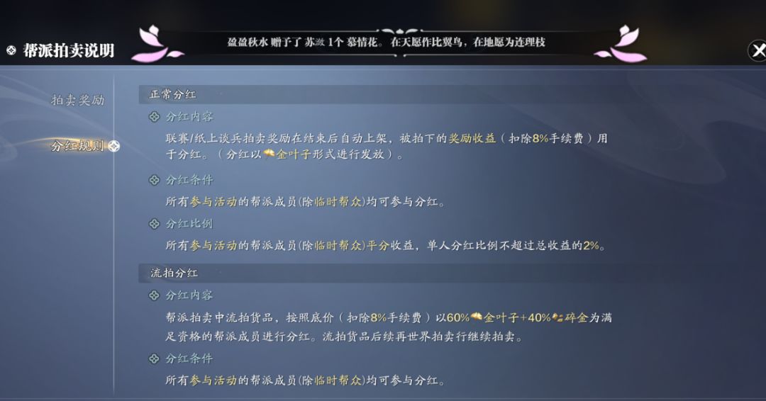 获取方式五:帮派每周工资,拍卖分红奖励