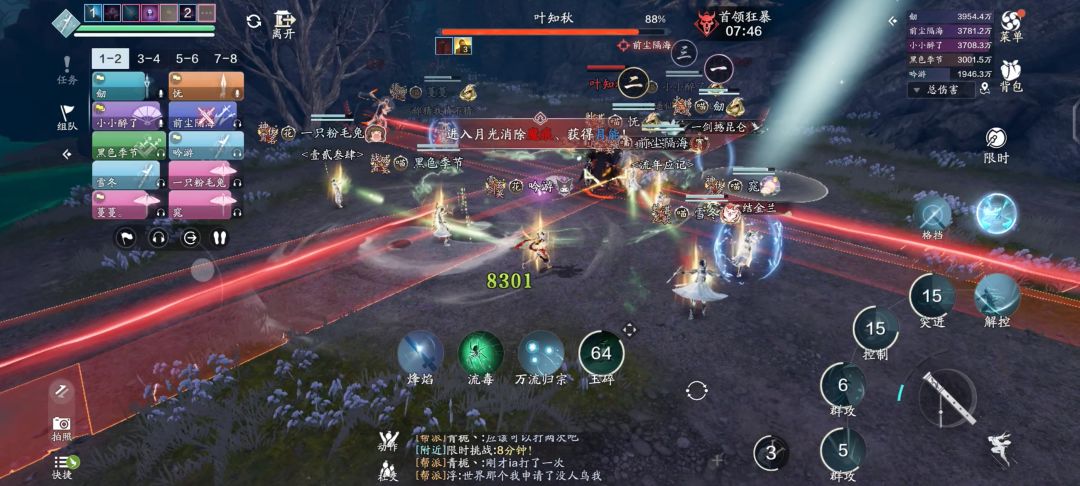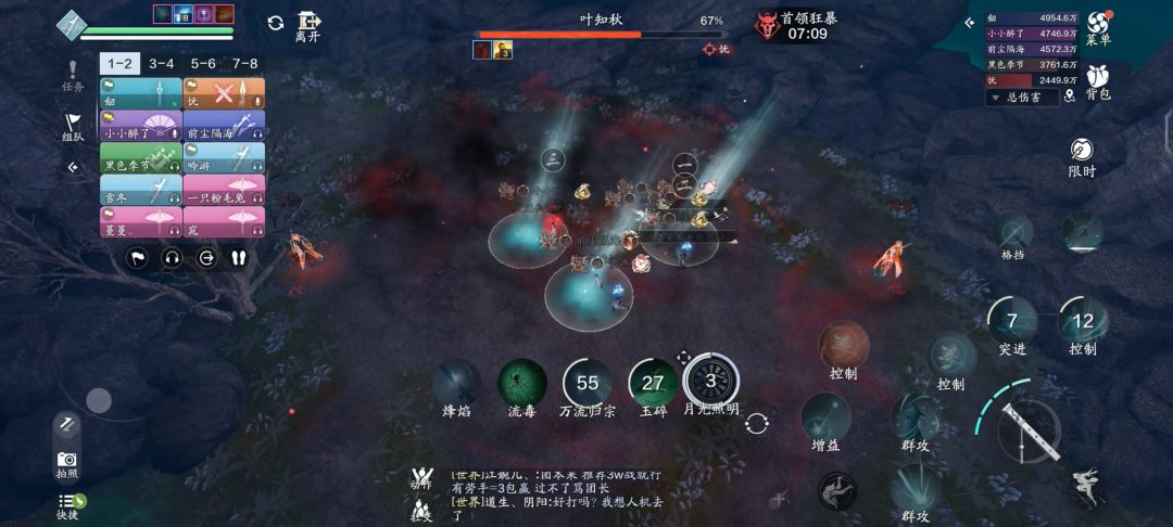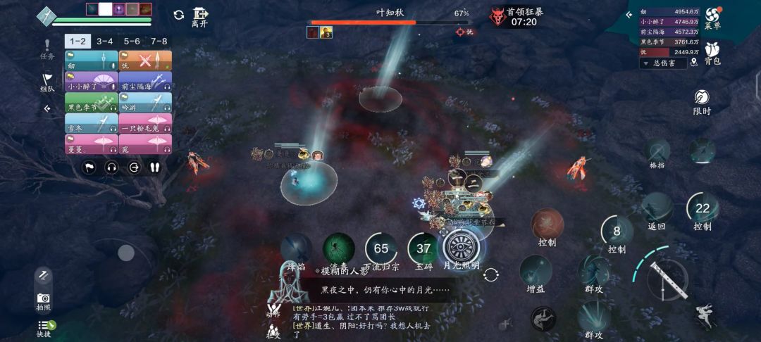 这期间叶知秋会释放全屏范围技能【万魔归宗】,为了保险起见,占线的少侠自身魔痕累积到5层以上时,就赶紧去月光下消除磨痕层数,由其他队友补位。
