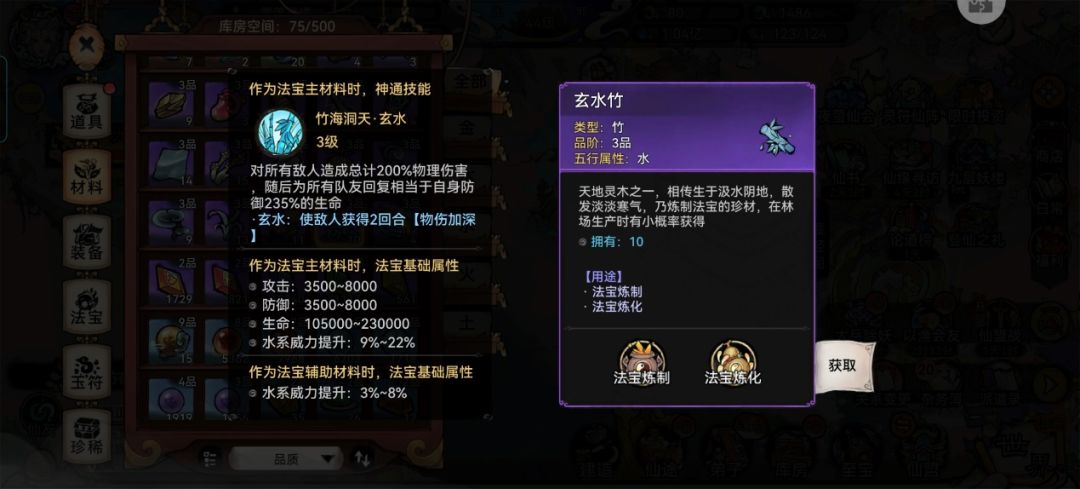 韩立作为输出是需要法宝威力加成的,水韩立推荐水皮和水竹子,金韩立可以使用庚金或者金牙作为法宝材料。
