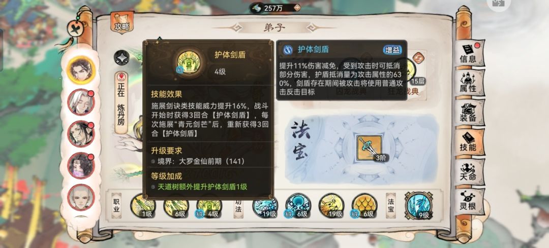 提升自身防御并且添加【物理免除】,大大增强了弟子的生存能力。防御转换攻击并且再动,配合囚笼能打出高伤害。