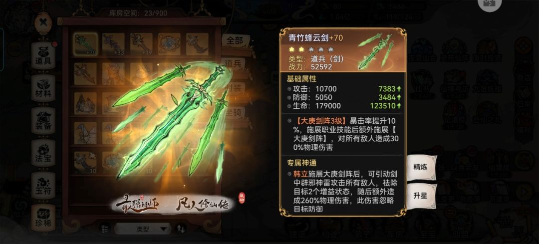 韩立的专属道兵可以使韩立施展职业技能后额外施展【大庚剑阵】,对所有敌人造成300%物理伤害,韩立专属神通可以引发辟邪神雷攻击所有敌人。韩立的一键三连就是这样形成的。