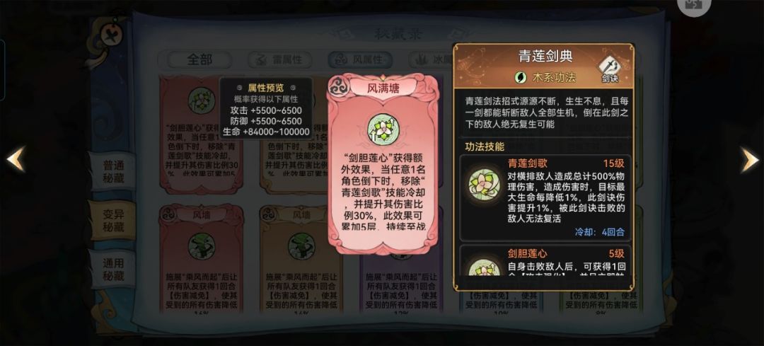 这里比较推荐变异木灵根为风灵根,因为灵根密藏风满堂大大加强的青莲功法,当任意角色倒下可以移除冷却时间,立刻施展青莲。