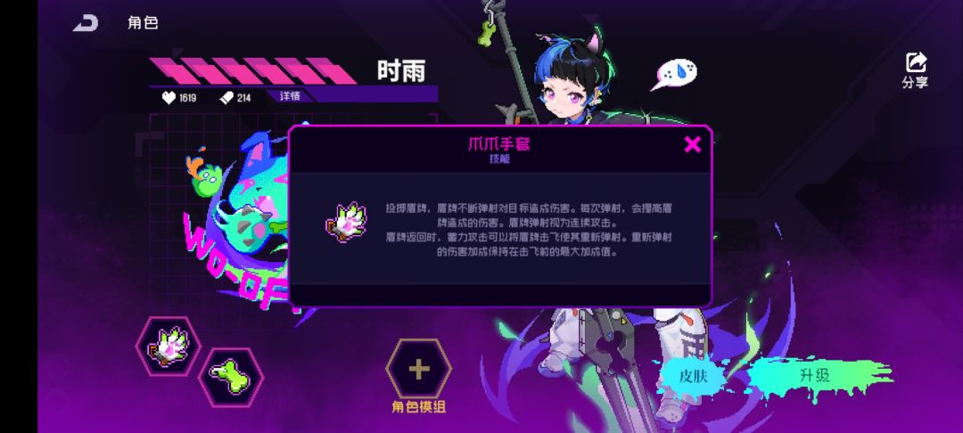 主动技能投掷出去一枚盾牌,盾牌会在外面弹射七次,伤害递增,盾牌带有追踪效果,弹射完后会回到时雨身边停留几秒,在这期间如果使用蓄力攻击可以将盾牌二次击飞出去,第二次击飞的盾牌会保持最大伤害继续弹射七次,打血比较多的怪的时候比较好用