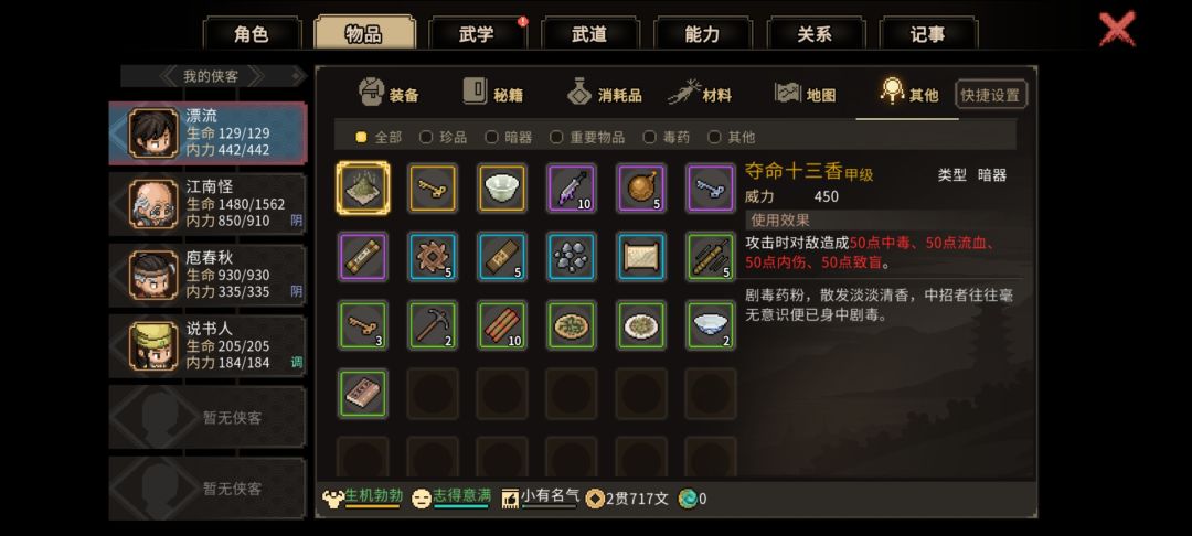 思路:开局道具卖钱,突袭富商去楚襄,买暗器,邀请江南怪,大梁邀请疱春秋,回小镇打大王寨,思路就这样,中间顺序不能颠倒