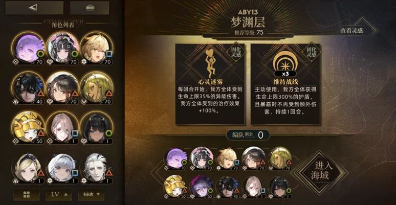 而在选人方面嘛......一个基础5人队是必备的,此外还能上5个替补,这个玩法中主力死了后替补是可以立刻顶上去的,所以大家的综合练度越高,通过这个玩法的难度也就相对越低,而目前想要过最高难度的梦渊层,基本上有一队60级左右的5人组就可以尝试了,此外这个玩法在选人上还需要注意:
