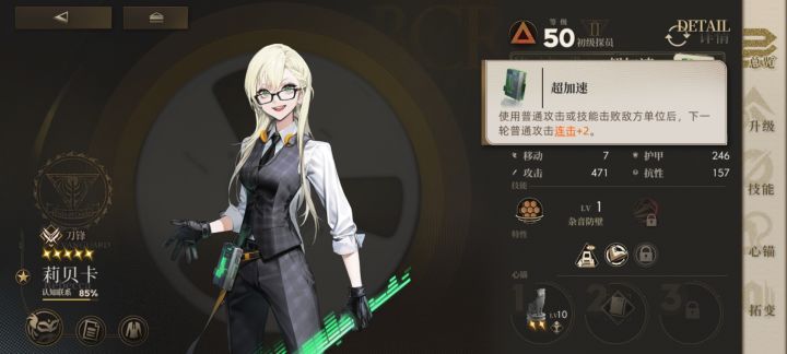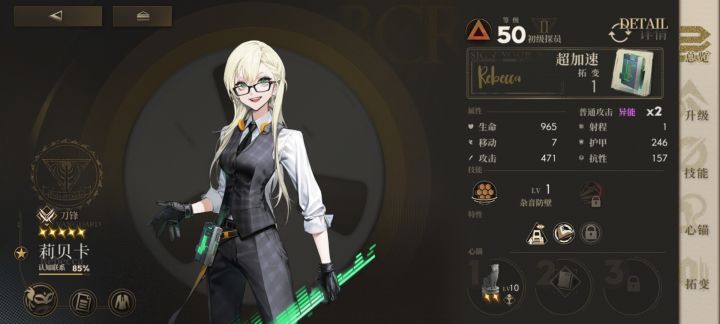 我的50级丽贝卡单动能打出伤害共计471*4=1884(假设敌方护甲为0)而50级小怪平均血量在600左右,即使假设极端情况小怪具有1-2偏斜(每偏斜无条件阻挡一次攻击)超高的攻击次数保证了丽贝卡的保底伤害,依然能打出2层伤害,小怪照秒不误。