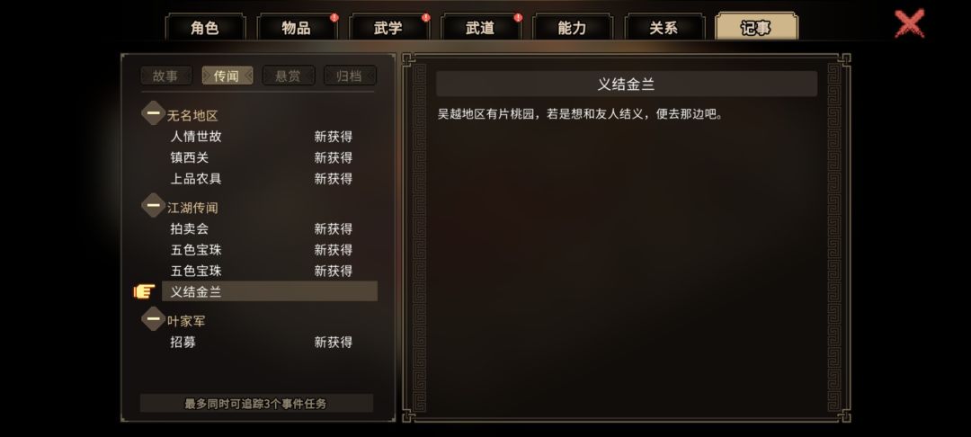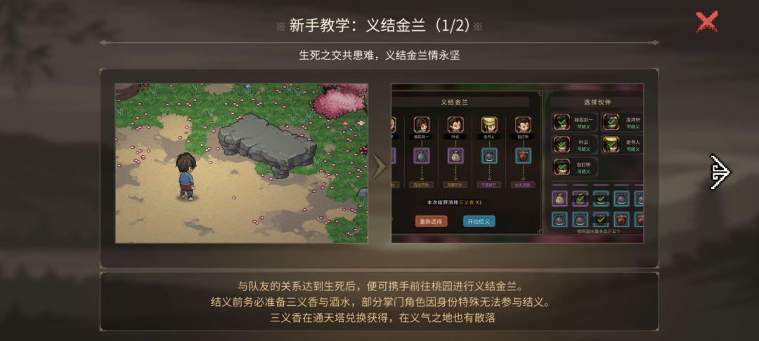 3.出城来到桃园,和老学究对话,了解结义注意事项:a.三义香和酒水(三义香通天塔兑换,不同酒水加成不同)b.结义后,降好感多的情况下会割袍断义 c.完成结义可以获得成就