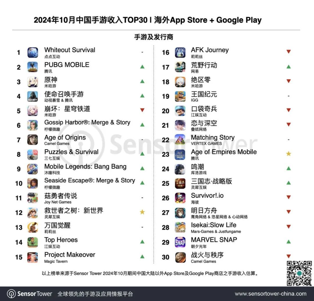 点点互动冰雪末日题材策略手游《Whiteout Survival 无尽冬日》10月推出“Gina's Revenge”、“State of Power”、“Diwali 2024”和万圣节主题活动,同时迎来版本更新和一系列内容优化,本期海外收入再次提升4%,超过1.1亿美元,蝉联出海手游收入榜冠军。