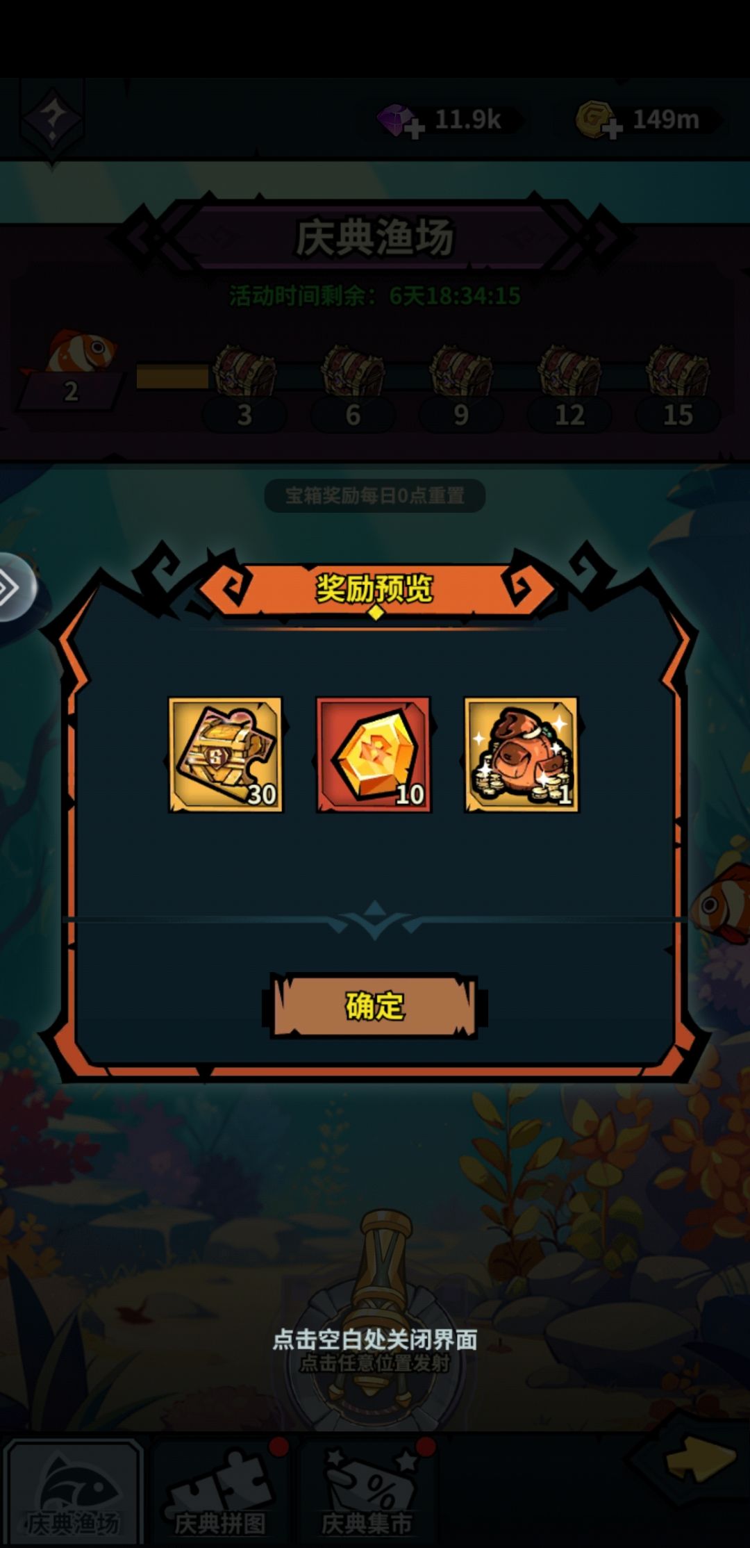 白嫖活动-庆典渔场-每天都可以白嫖5个宝箱,有s神器碎片,洗练锁定石等等,挺不错的。最后一条鱼有点难抓。