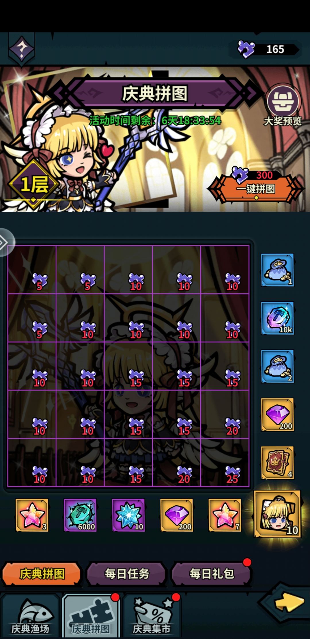 氪金活动1-拉菲拉-群攻后排法师,神器有眩晕功能。该活动完成一层就需要300碎片,即为1个648。每层奖励不同,有英雄碎片,红色套装,拉菲拉神器。目前满氪实测22个648能一专属神器,一满星拉菲拉,两套共8件(差戒指)红色套装。活动6天,可白嫖165*6=990,能白嫖一个光法和50碎片还有3整张拼图的奖励,满氪党可省3个648。
