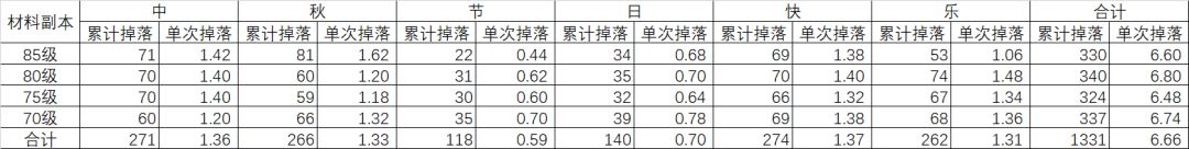 经过两天测试,消耗8000体力,完成70-85级材料本清剿各50次,合计200次,掉落统计如下: