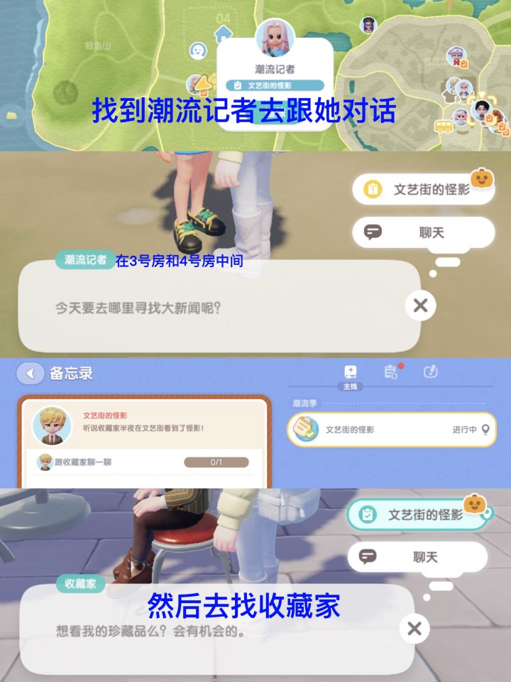 1⃣️在地图上找到潮流记者(在3号房和4号房中间)与她对话