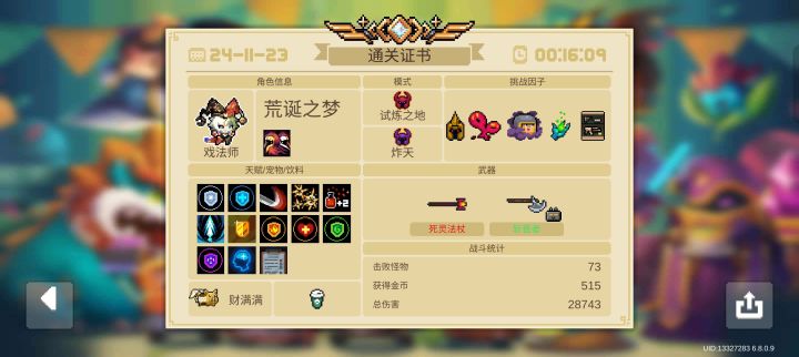 戏法师技能伤害占比太高,啥主武器配着都影响按技能,全自动斩首者就很配,带个减蓄力连击次数增加和加近战范围弹幕根本没有威胁,有全自动斩首者就算用死灵法杖也不怕在人堆里找不到自己位置,太爽了!