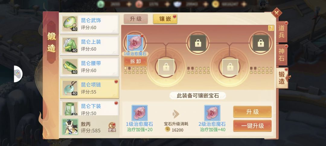 另外道兵装备别忘了镶嵌宝石!很多修士队伍目前都是缺少治疗,这点可以用道兵-敖丙补充,优先将敖丙身上的治愈魔石点满,增加队伍整体存活概率~