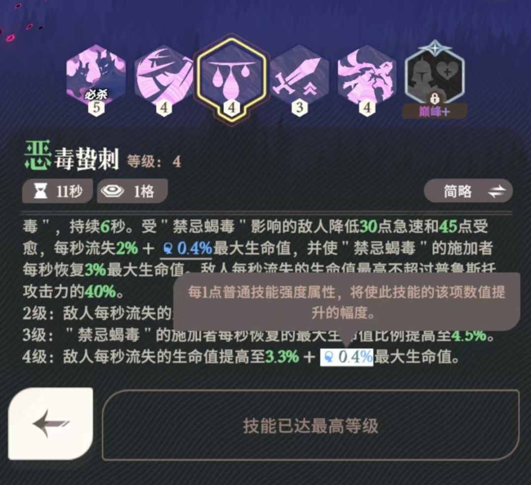 由于无尽内boss庞大的血条,实际上蝎子的流血数值一直是取决于自己攻击力这个最大值,而不是技能倍率,哪怕把流血的倍率提高到100,最后每秒伤害也是蝎子攻击力的40%,这也是为什么蝎子明明升高练度没有质变却仍然需要高练的原因,蝎子需要的是攻击力的基础数值,而巫术的普通技能强度只提升了技能的倍率并没有挑战攻击力阈值,所以五点普通技能强度完全是浪费的。