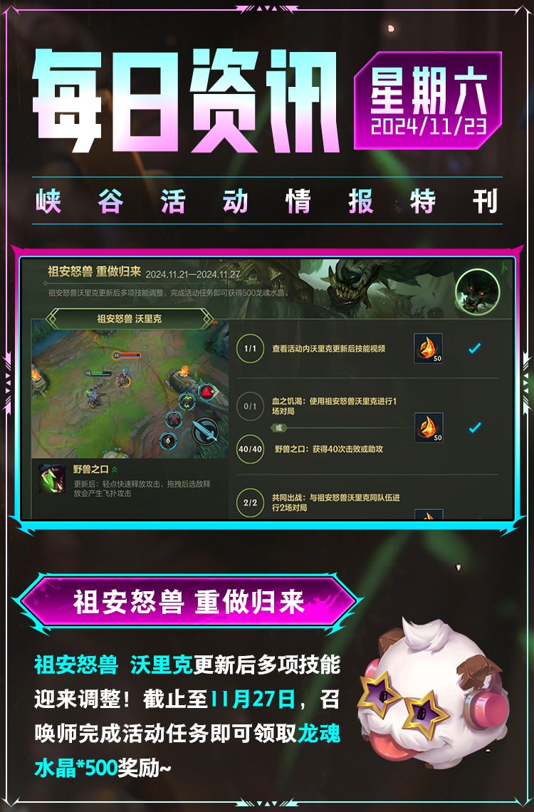 截止至11月30日,召唤师完成对应阶段的任务,即可实现科学狂人 吉格斯、龙魂水晶*3000和专属大奖随心三选一!