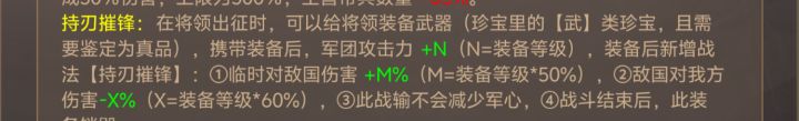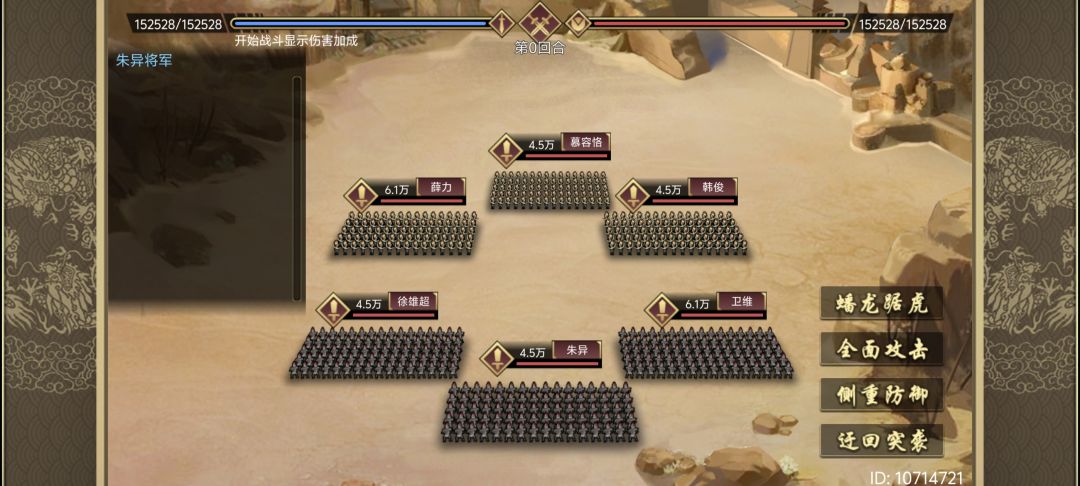 使用蟠龙踞虎战法直接调换兵力,前四把不需要sl直接打过(每次打完军团直接销毁,所以需要至少五个名臣当主将)。第五把的时候需要适当sl有概率打不过的,当获得争霸值五点的时候需要给主将装备上真武珍,在后续五把用得上。如图9就是装备武器的,还是所有蟠龙踞虎,调换军团进攻