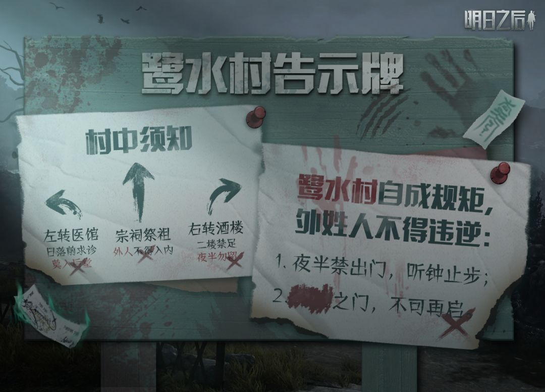 今天,联盟探险小队在鹭水村失联前传回了一张照片,一块古老的告示牌矗立在村口,破损的木板上涂满警告与禁忌。