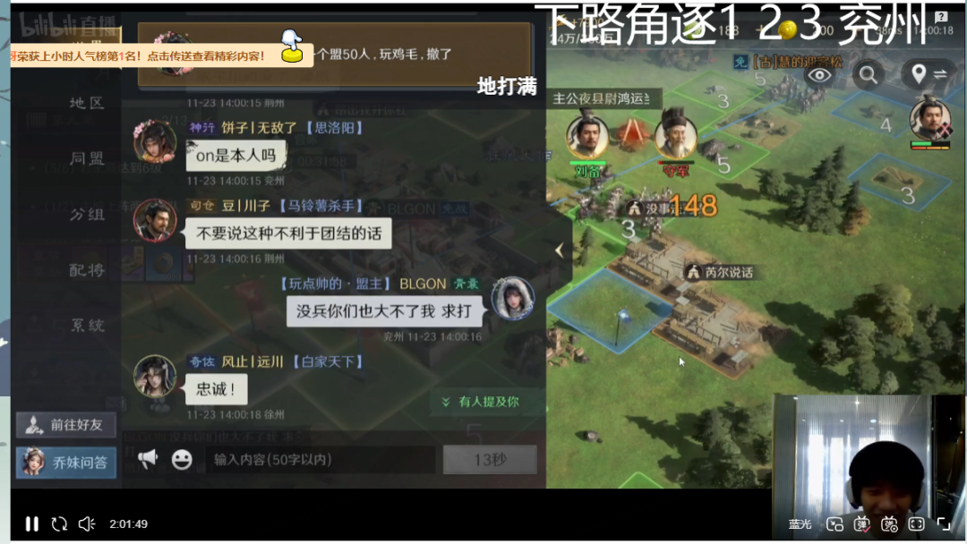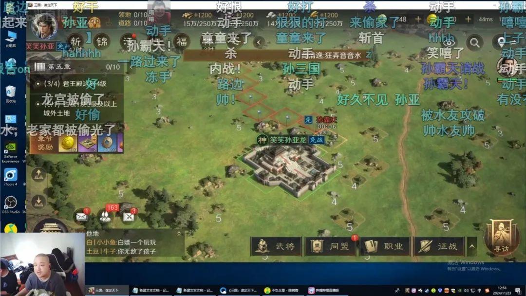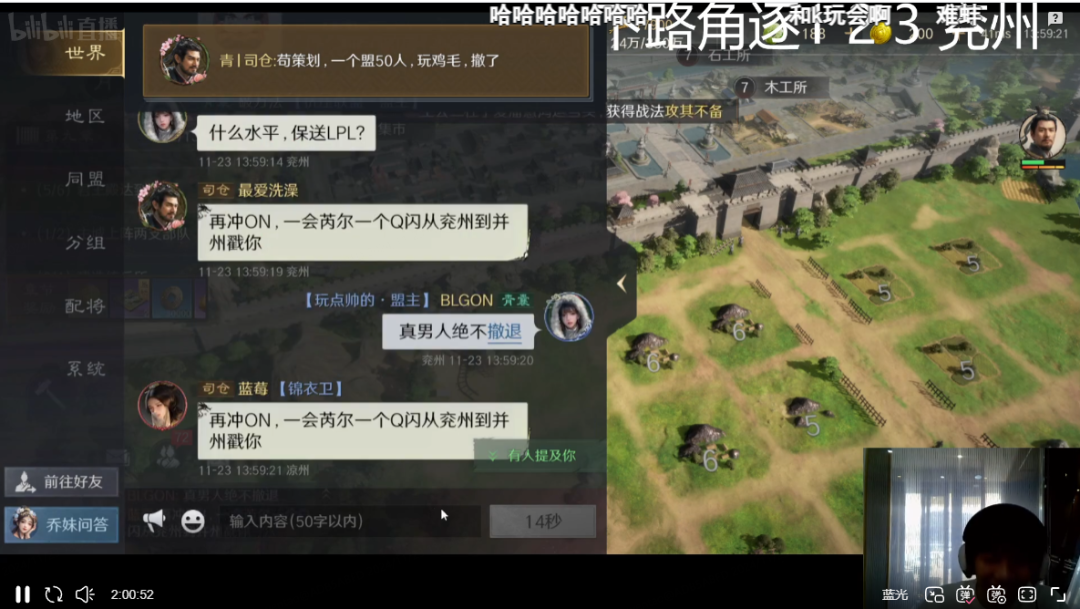 当然,LOL选手在《三谋》里对线,总会产生一些意料之外的直播效果。比如开服没到一个小时,笑笑还在直播详述攻打ON的战术,回头一看已经有水友来偷自己家了,赶紧大喊:“别打啊,我们在直播啊不能输这么快!”;另一边的ON倒是很泰然自若,甚至还有心情在世界频道放狠话“求打”“真男人绝不撤退”……