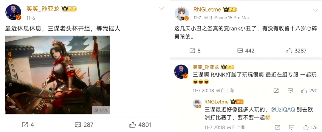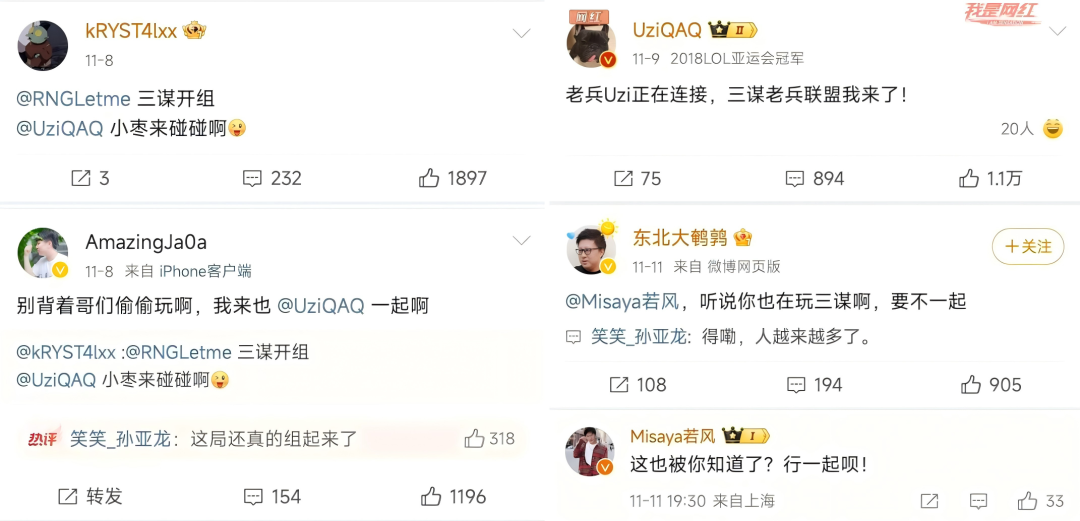 见状,笑笑也不装了,直接发微博摇人,说要组个《三谋》老头杯。这不摇不知道,一摇才发现,LOL圈里有一堆玩《三谋》的。
