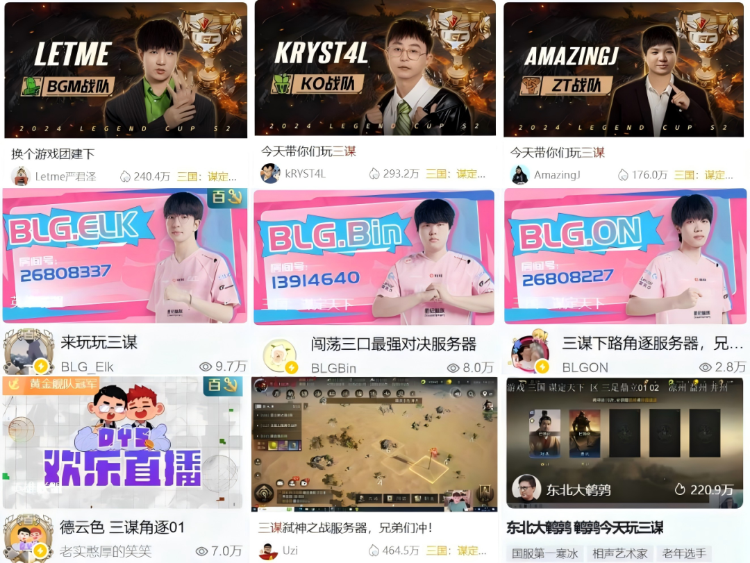 今天主题服开服后,几位LOL主播、选手的直播间,很快成了各大平台的《三谋》热门频道,其中不乏观看人数上百万的大热频道。这可能说明《三谋》玩家对LOL明星大乱斗很感兴趣,或许同时也意味着,LOL玩家乐意跟着主播了解《三谋》。