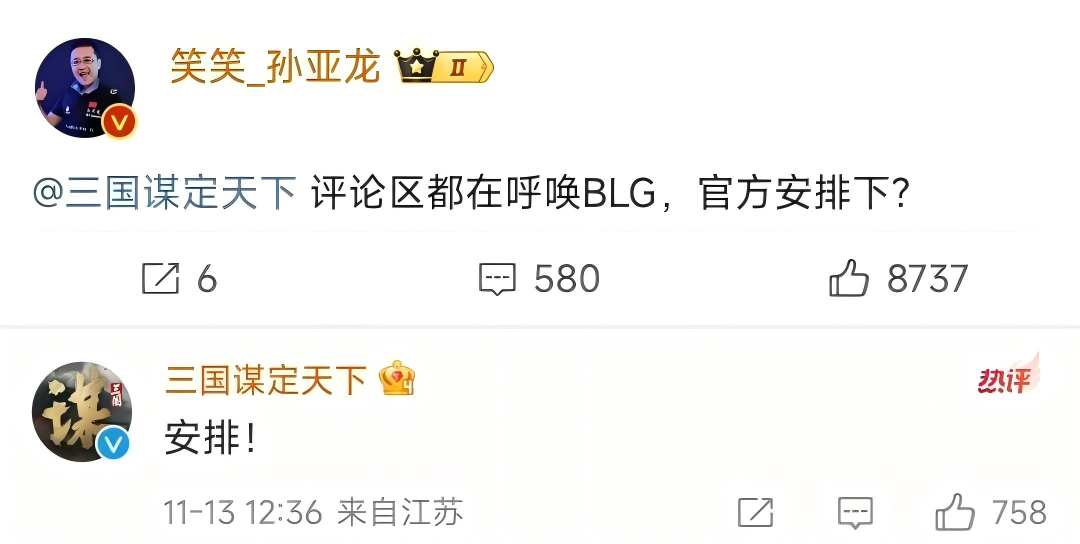 眼看参与老头杯的主播越来越多,水友开始怂恿笑笑去拉刚打完S赛的BLG下场。于是他又艾特了《三谋》官方:“安排下?”后者也很快回应,“安排!”不仅安排BLG加入比赛,游戏官方还特地准备了个更体面的比武台——直接把半周年主题服做成了和BLG及主播的联动服。