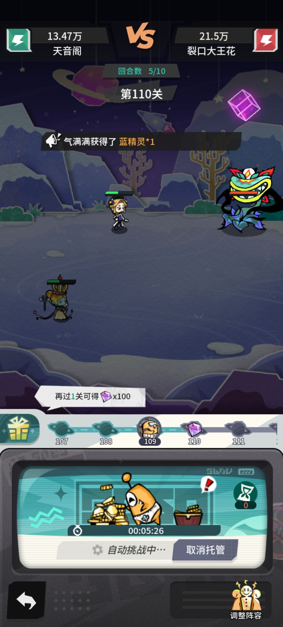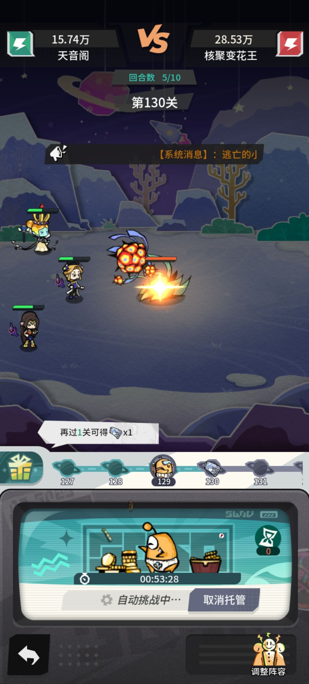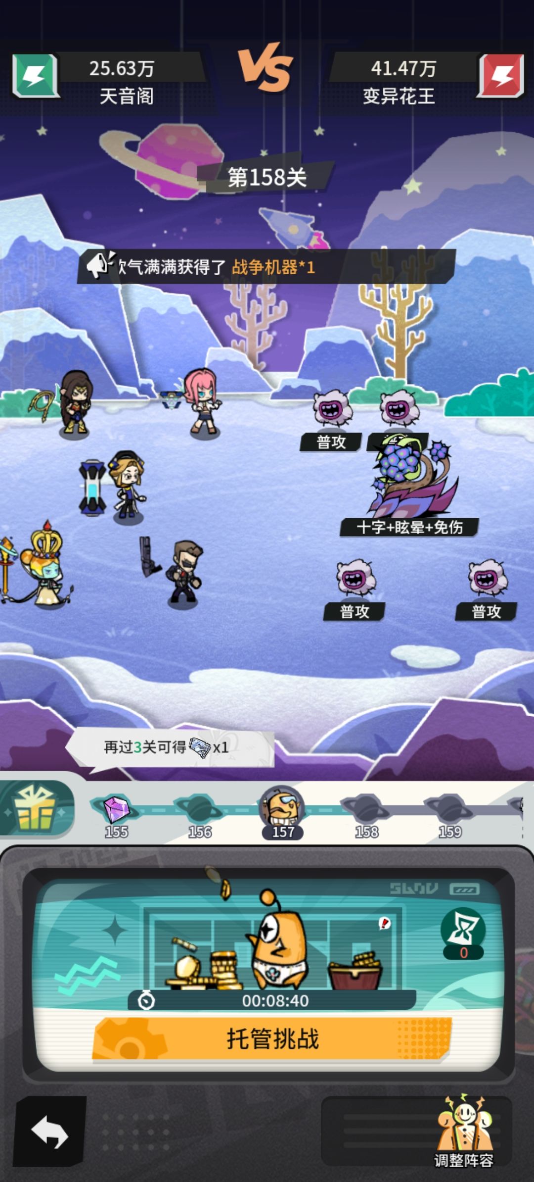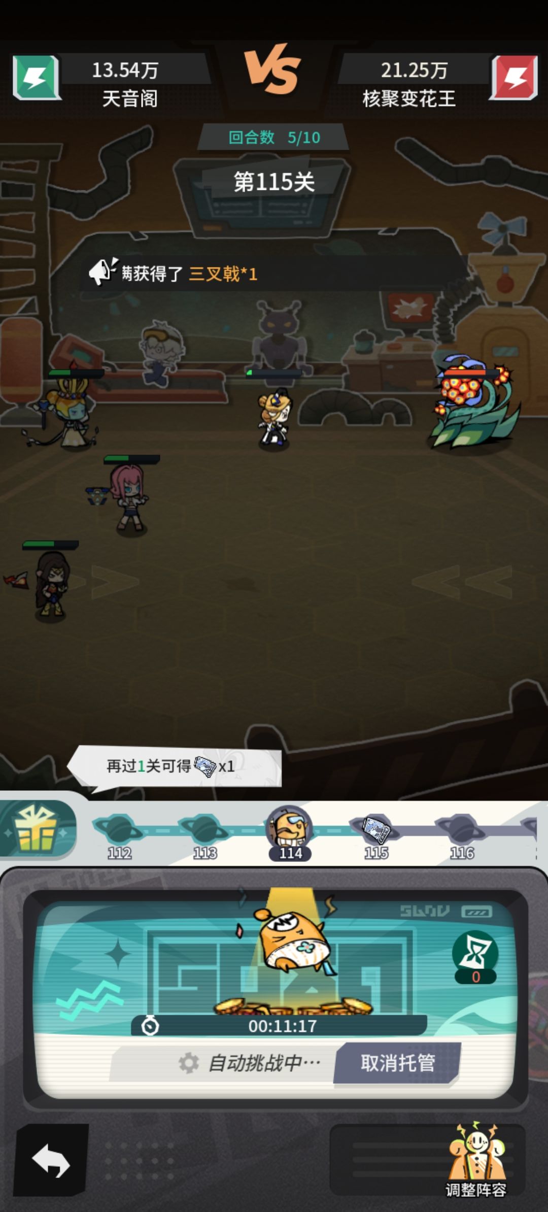基地升到46级后,解锁风力发电机,有一波很大提升,此处直接挂机到146不换阵容不卡关,正常120-130的配置