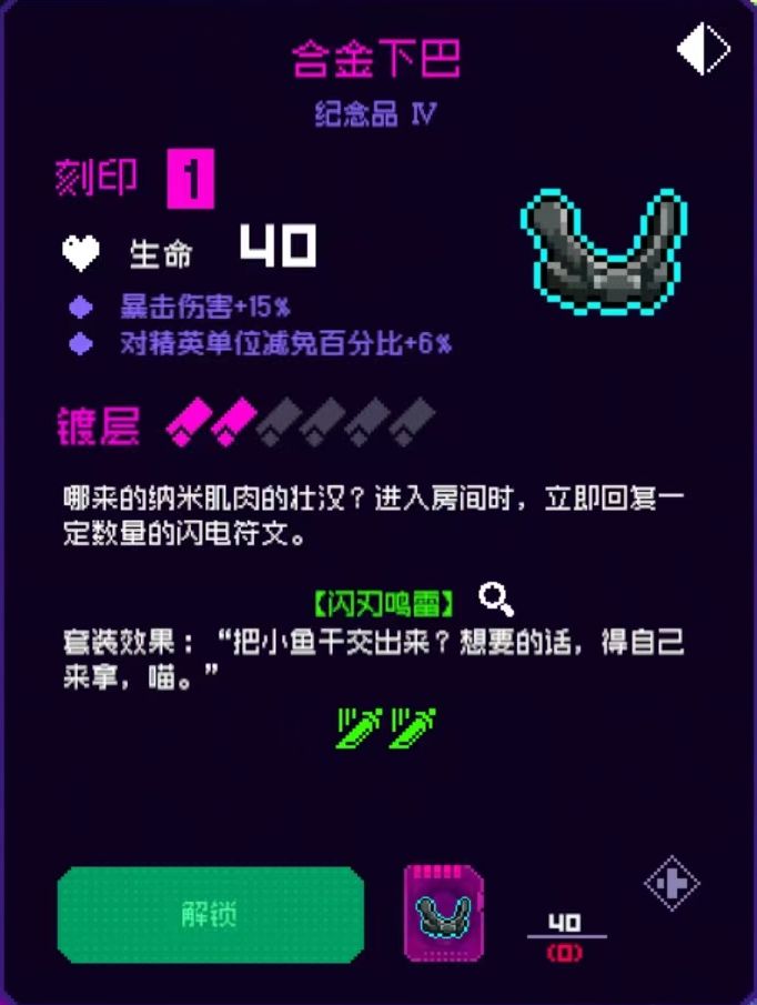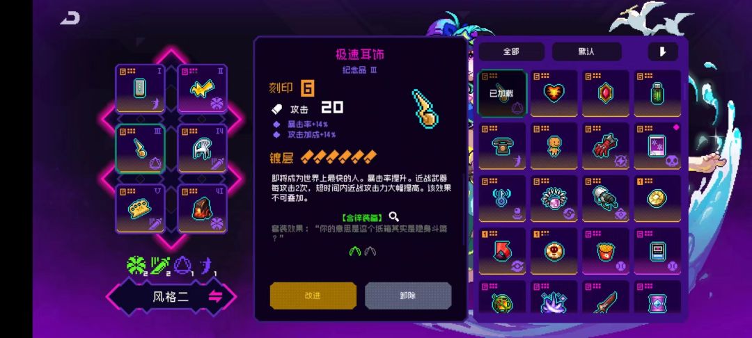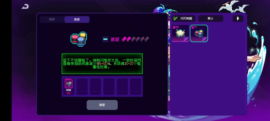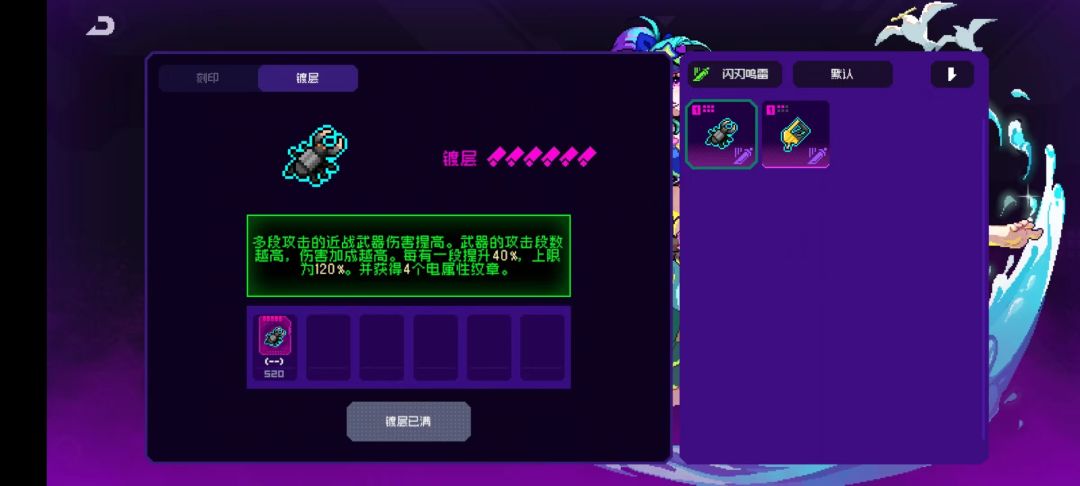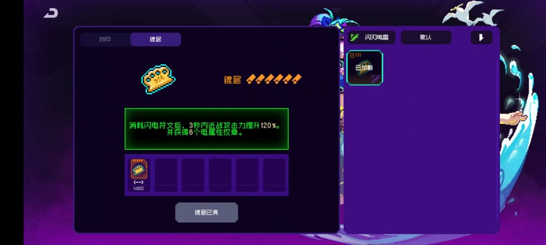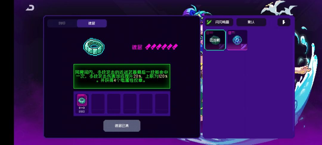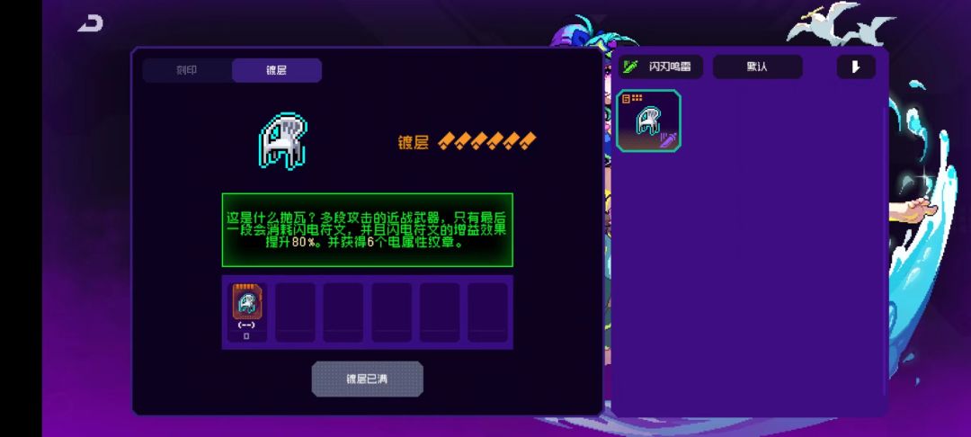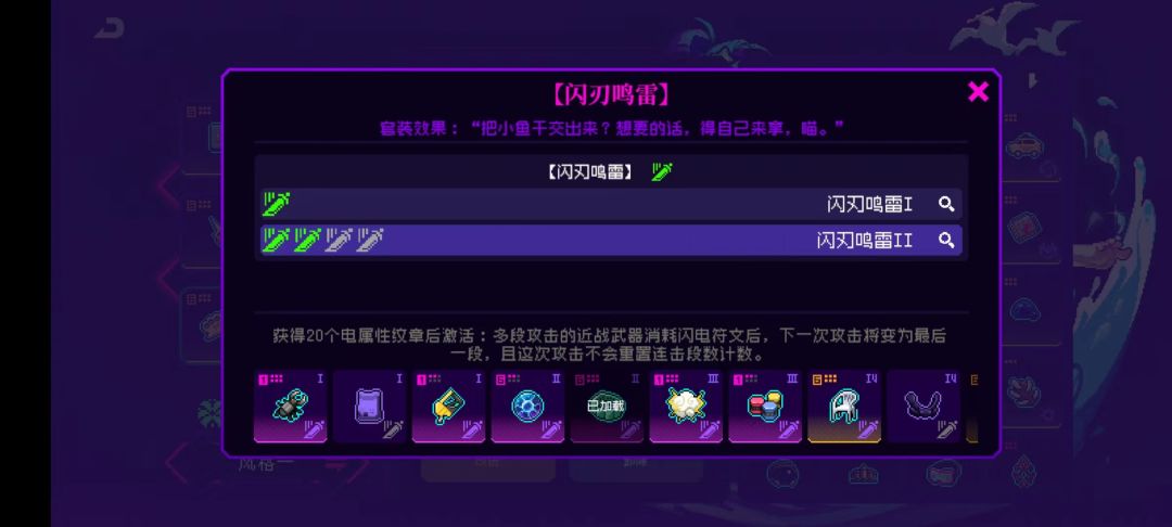 10个纹章效果:每隔3s获得一个闪电符文,近战武器攻击时消耗一个闪电符文,并提高50%近战伤害(这50%近战伤害是独立乘区)这个效果特别重要,可以说闪刃鸣雷套装就是围绕这个效果的,闪刃鸣雷特别多纪念品需要消耗闪电符文