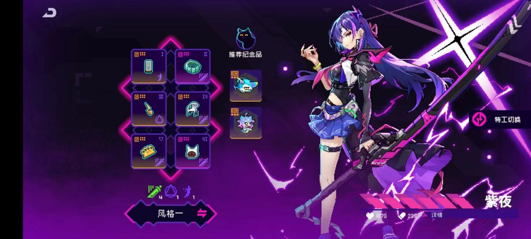 紫夜出装就是纯闪刃雷鸣了,时空里可以选择混搭刀二(这个具体我会放在紫夜的角色帖子里,这里就不多赘述了),紫夜宠物可以选择鲨鱼和暗网,因为鲨鱼和暗网的回复是叠加的,选猫也可以。