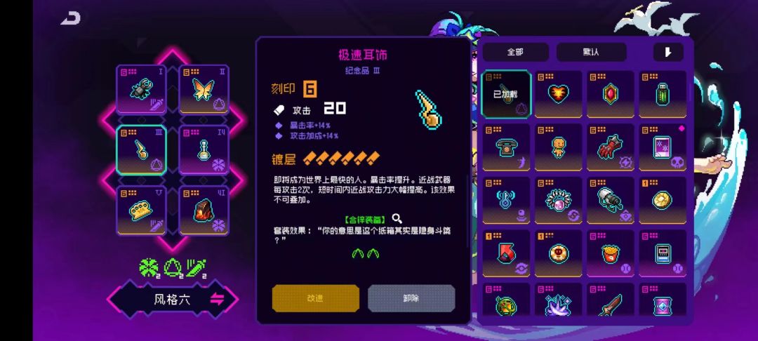 而且指虎和耳饰这俩纪念品可以给所有近战都提供加成,可以给业火和刀二加成。