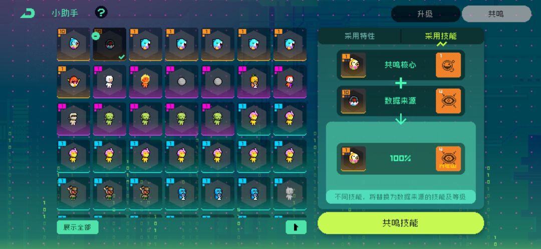 点击容器的特性 → 共鸣 → 采用技能,下面放我们的暗网,如图!宠物上下顺序不要搞反了!选择采用技能!别选成采用特性了。一定要小心操作。最后点击共鸣技能 → 保留结果,这样就可以把暗网技能转移到咸鱼身上了。
