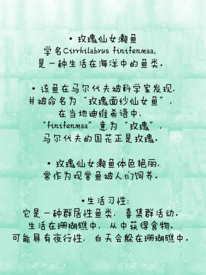 • 该鱼在马尔代夫被科学家发现,并被命名为“玫瑰面纱仙女鱼”,在当地迪维希语中,“finifenmaa”意为“玫瑰”,马尔代夫的国花正是玫瑰。
