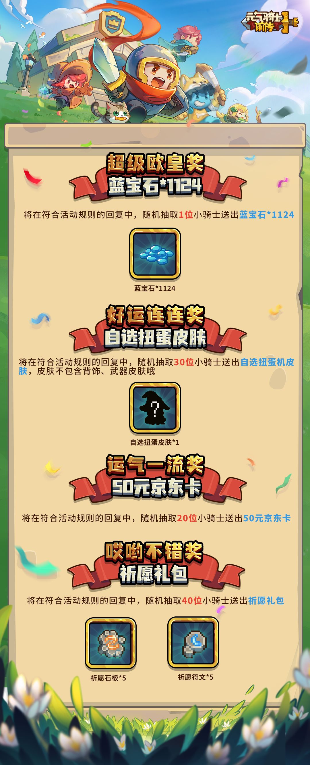 ————在本帖底部留下你一周年想说的话(可带PID),村长抽点小骑士送点礼物,礼物见下图哦!