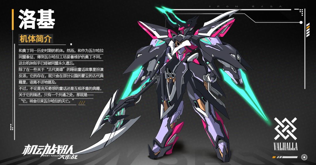 【洛基】:和奥丁同一历史时期的机体。然而,和作为瓦尔哈拉同盟象征、得到瓦尔哈拉工坊妥善维护的奥丁不同,这台机体似乎已经被同盟永久遗忘。