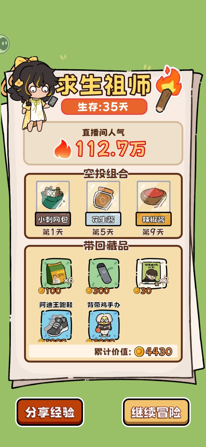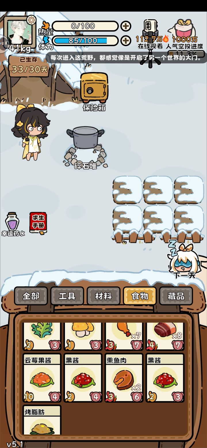 第一天的话还是开局砍树 弄石头 喝一次体力药 做陷阱 第一天打到猎物就第二天生火