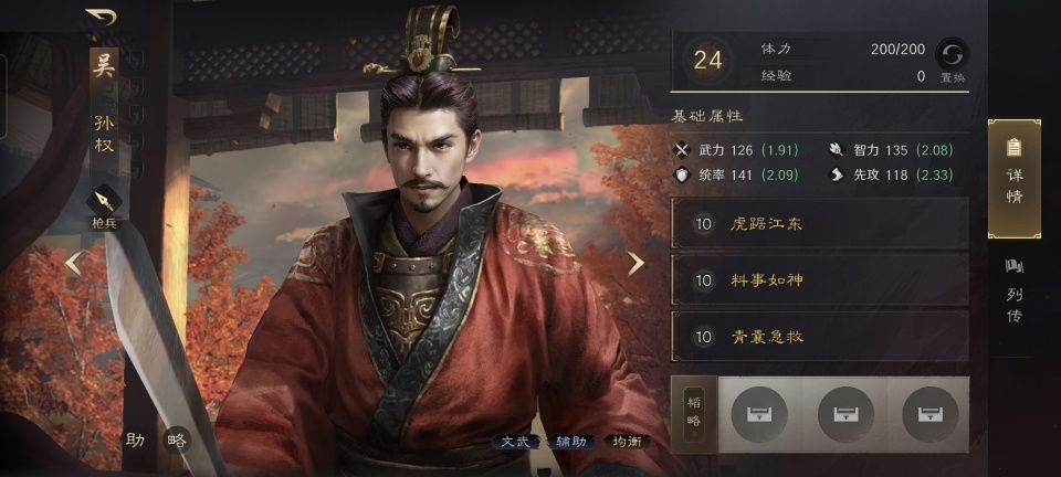 孙权战法:虎踞江东+料事如神+青囊急救。后续两个都是主动战法,则全队的主动战法发动率提升14%,黄盖在前排的火攻和强制能力都因此变得更加牢靠了。