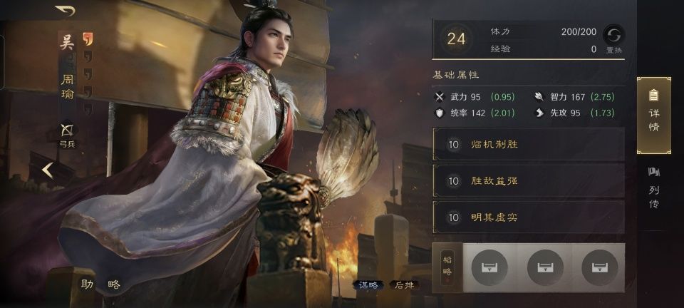 周瑜战法:临机制胜+胜敌益强+明其虚实。这支队伍总共可以对敌方施加火攻、嘲讽、缴械、技穷四种一场状态,足够周瑜的临机制胜高频率触发了。
