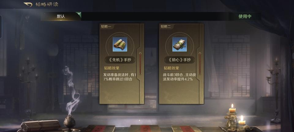 左慈战法:云行雨施+折冲御侮+金城汤池。韬略库:受到当前等级制约,只研读了练士残章和合战善本。