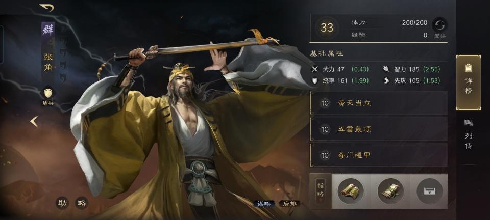 张角战法:黄天当立+五雷轰顶+奇门遁甲。韬略库:受到当前等级制约,只研读了先机手抄和励心手抄。此战摆出的阵型是箕形阵,左慈在前,于吉和张角在后。值得注意的是,于吉的默认战法直接就能开闸放水,而且他的先攻值也要高于张角,所以他们的水雷联动会相当的顺畅。