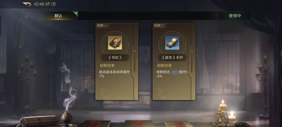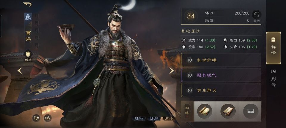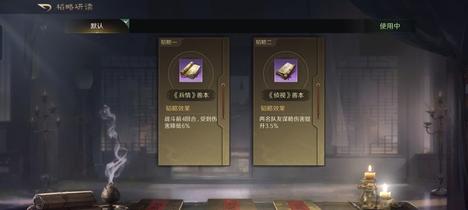 曹操战法:乱世奸雄+避其锐气+舍生取义。韬略库:受到当前等级制约,只研读了兵情善本和侦视善本。