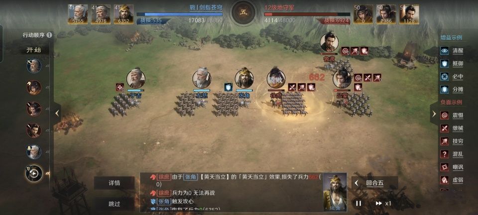 张角战法:黄天当立+奇门遁甲+五雷轰顶。韬略库:万全善本+太平道法(专属)+机动善本。剑盾兵特性专注,专精点亮百战百胜。此战摆出的箕形阵,左慈在前排打掩护,于吉和张角在后排唱双簧。于吉在游戏里的先攻高于张角,洪水先于雷电到位,水雷联动自然格外酸爽。当然,左慈的云身也是起到了决定性贡献的。