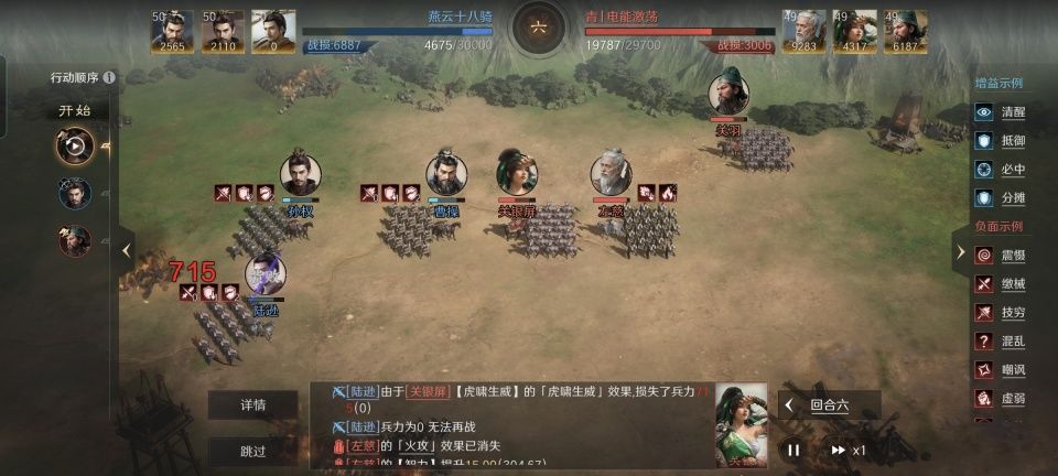 关羽战法:威震华夏+冲锐巧变+水淹七军。韬略库:机动善本+励心善本+王预(专属)。轻骑兵特性疾驰,专精点亮骁勇善战。总的来看,原理倒也是挺直接了当的。让左慈在箕形阵的前排打掩护,关银屏则是负责施加虚弱和畏惧,把主要的输出担子甩给了关羽,当然这次他必定能扛起来。