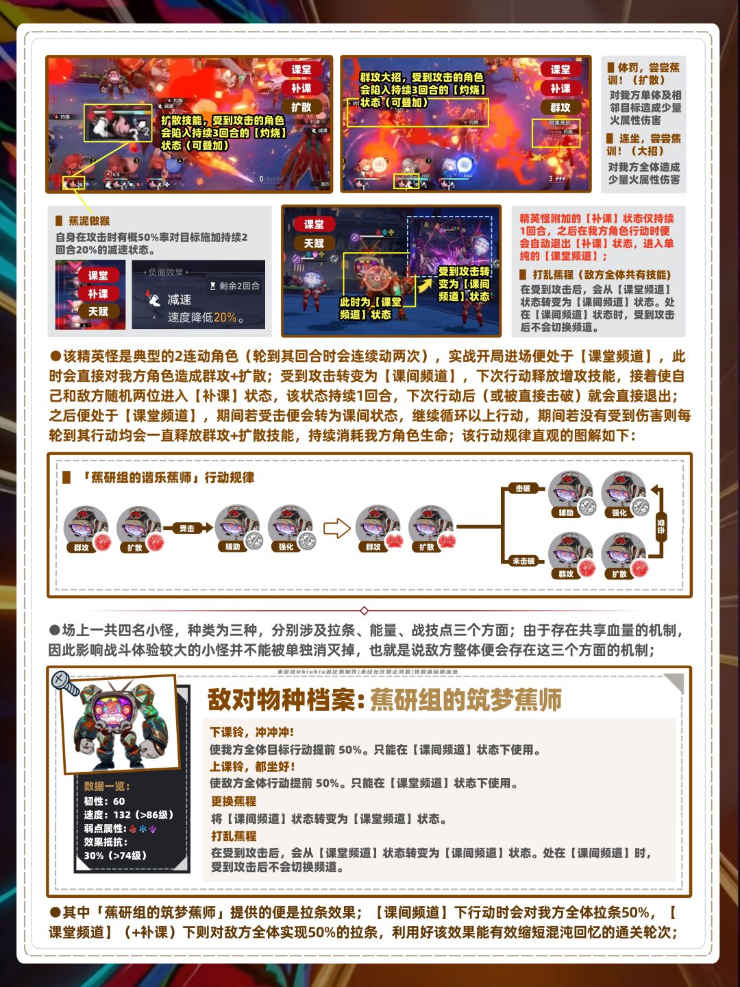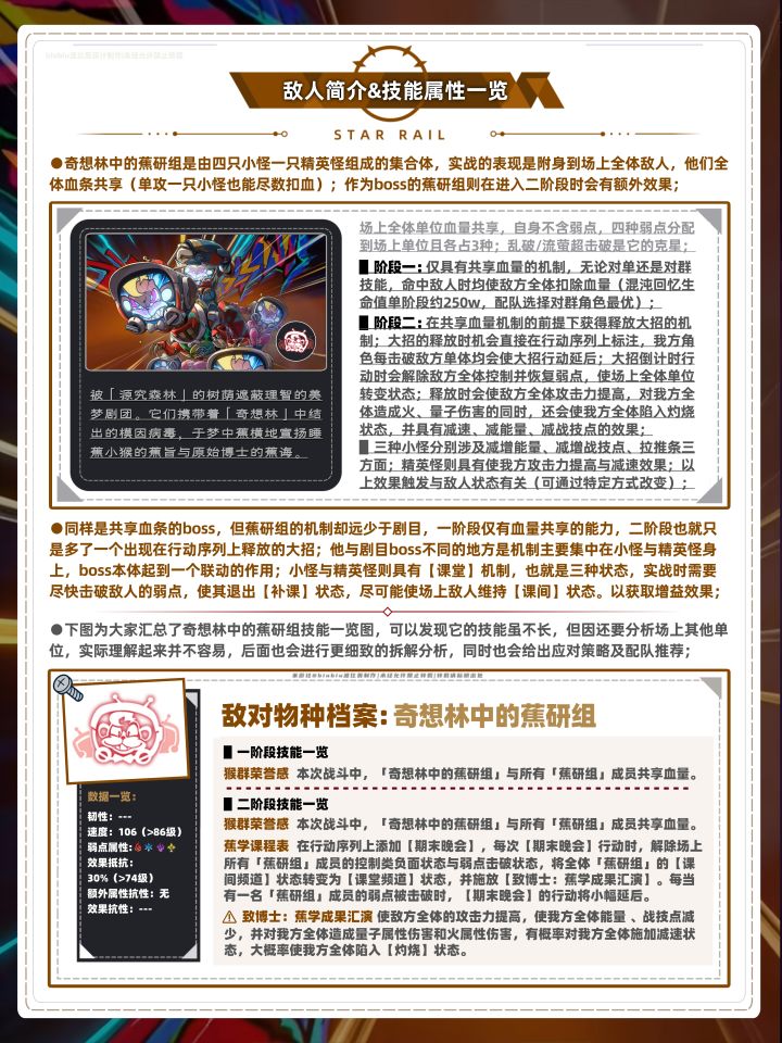本期蕉研组的相关攻略到这里就结束了;关于其他敌对物种的机制解析,需要的宝子可以点开主页直接前去查看,都在往期的混沌攻略中有所分析;当然帖子分析有限不能做到面面俱到,有错误或需要补充的地方也欢迎大家外评论区提出;同时也特别欢迎大家分享自己的通关配队及策略;
